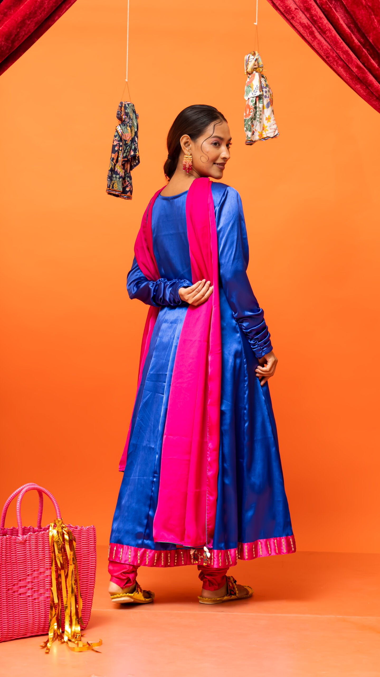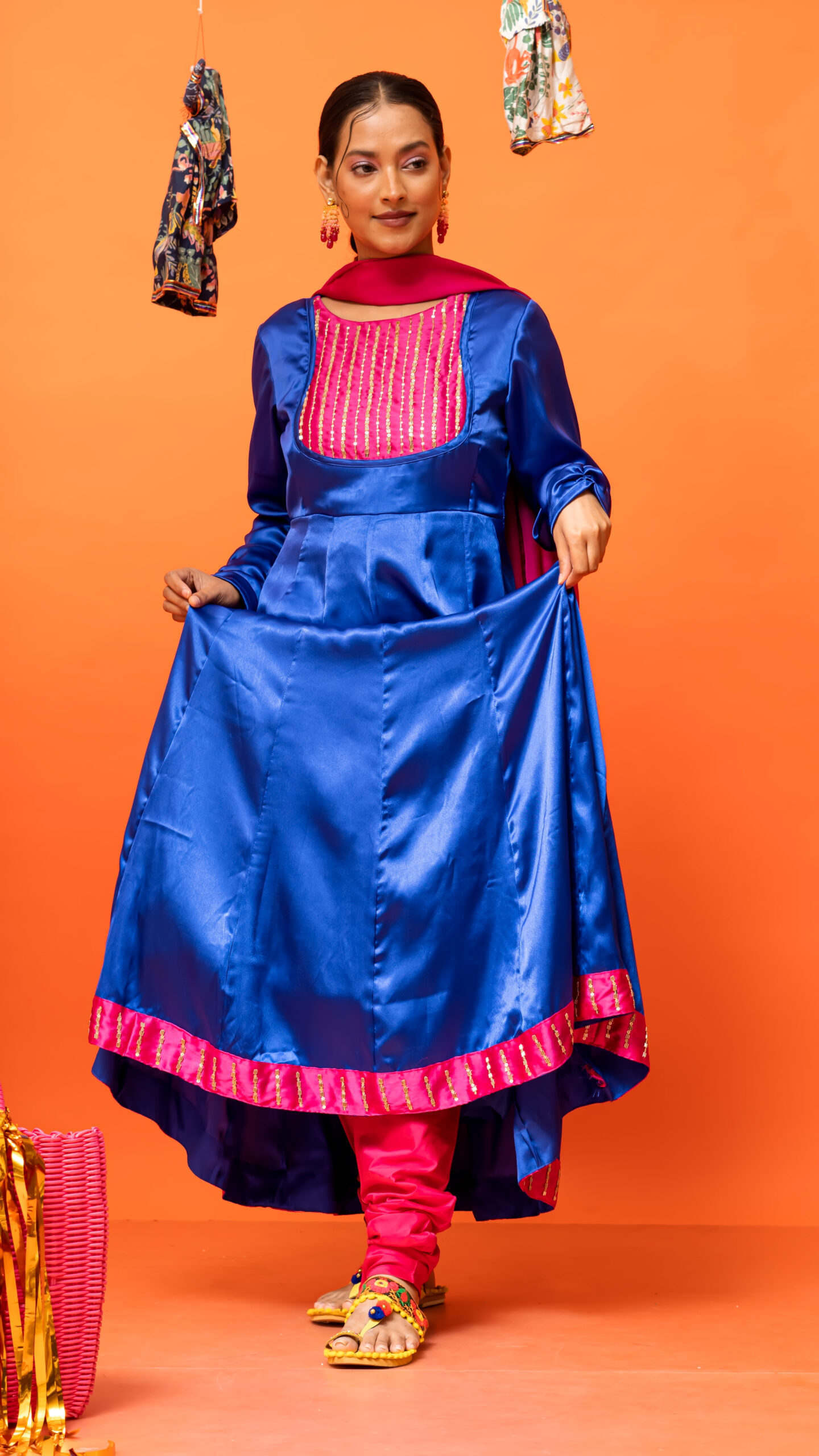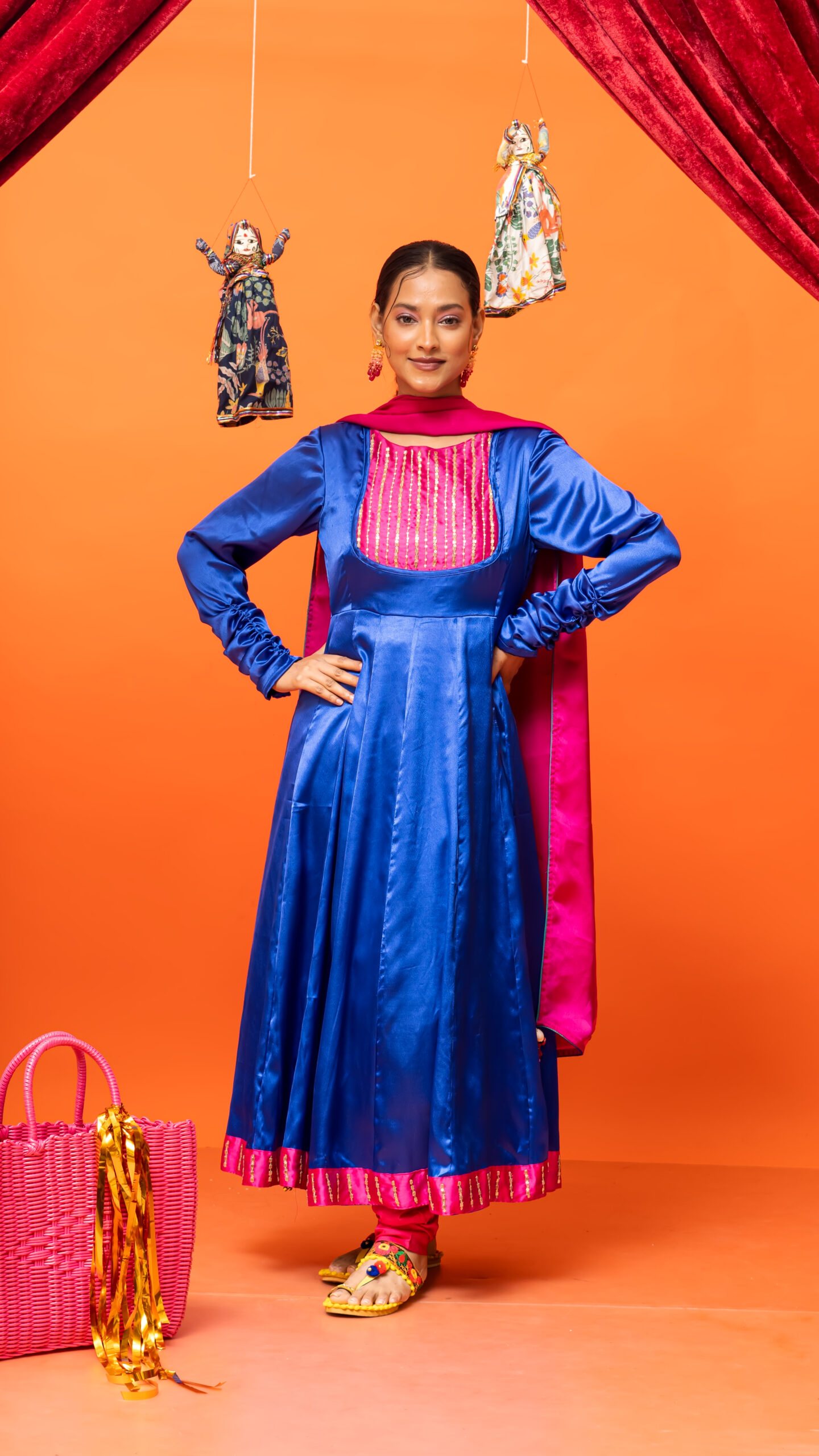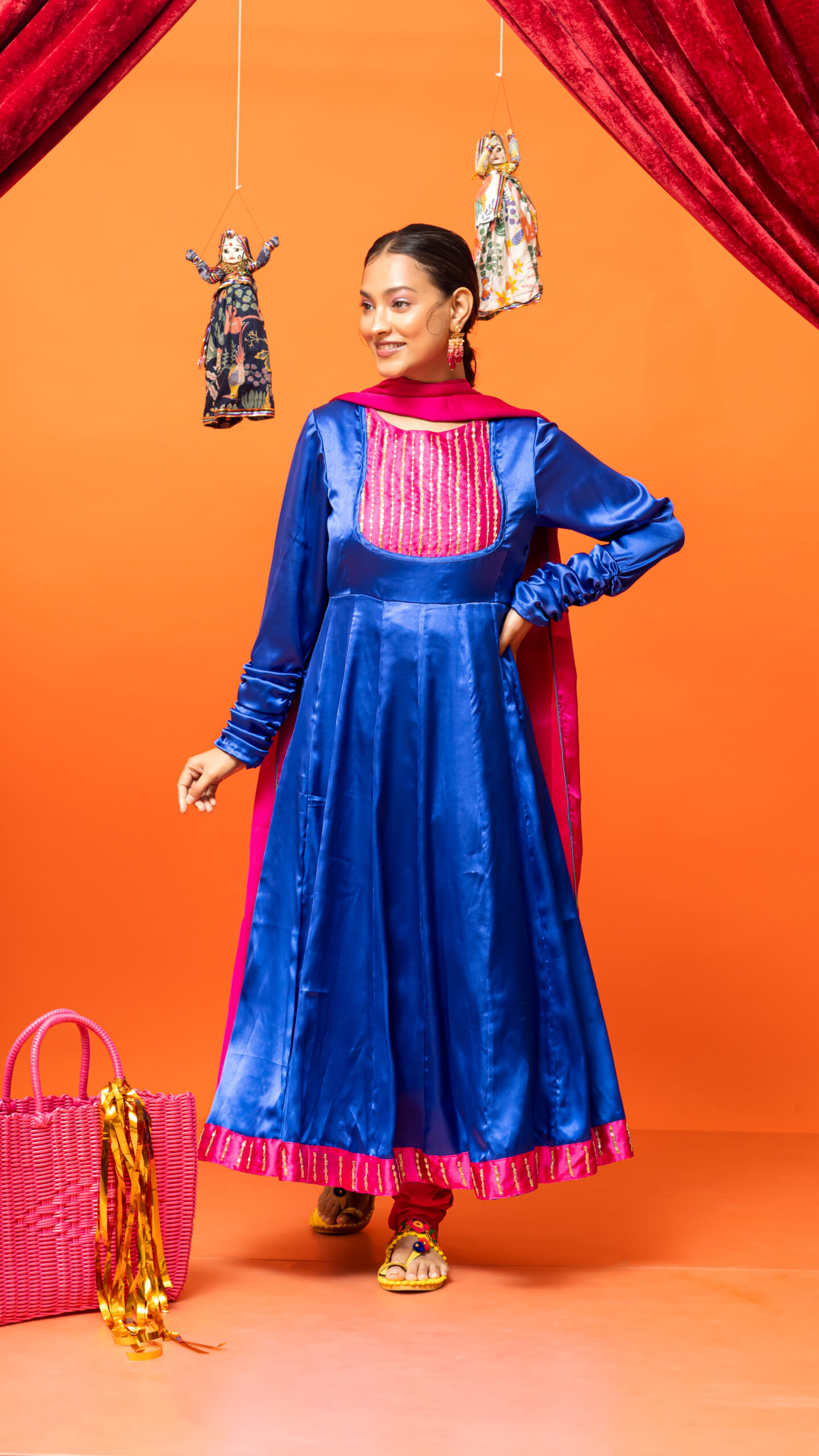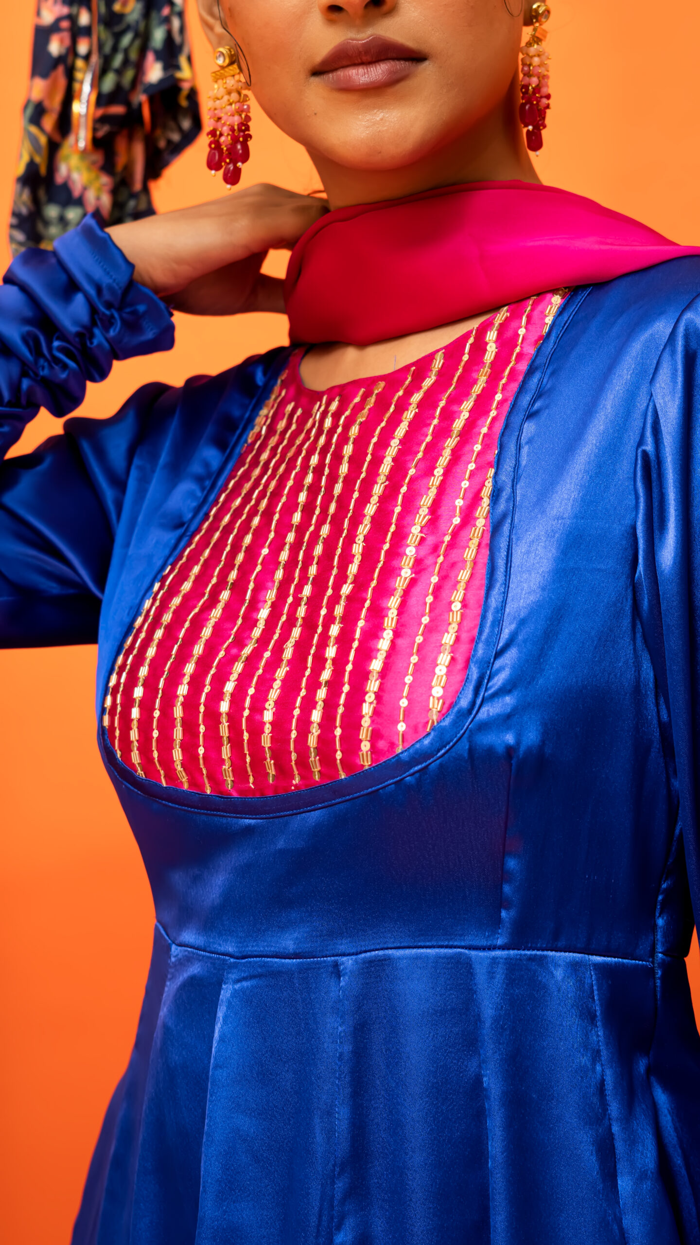 Product Description: Crafted in lustrous Sapphire-blue Luxe Satin, this full-length anarkali is adorned with a vibrant Fuchsia yoke intricately hand-embroidered with golden threadwork, adding a festive sparkle. The ruched full sleeves bring a contemporary touch.